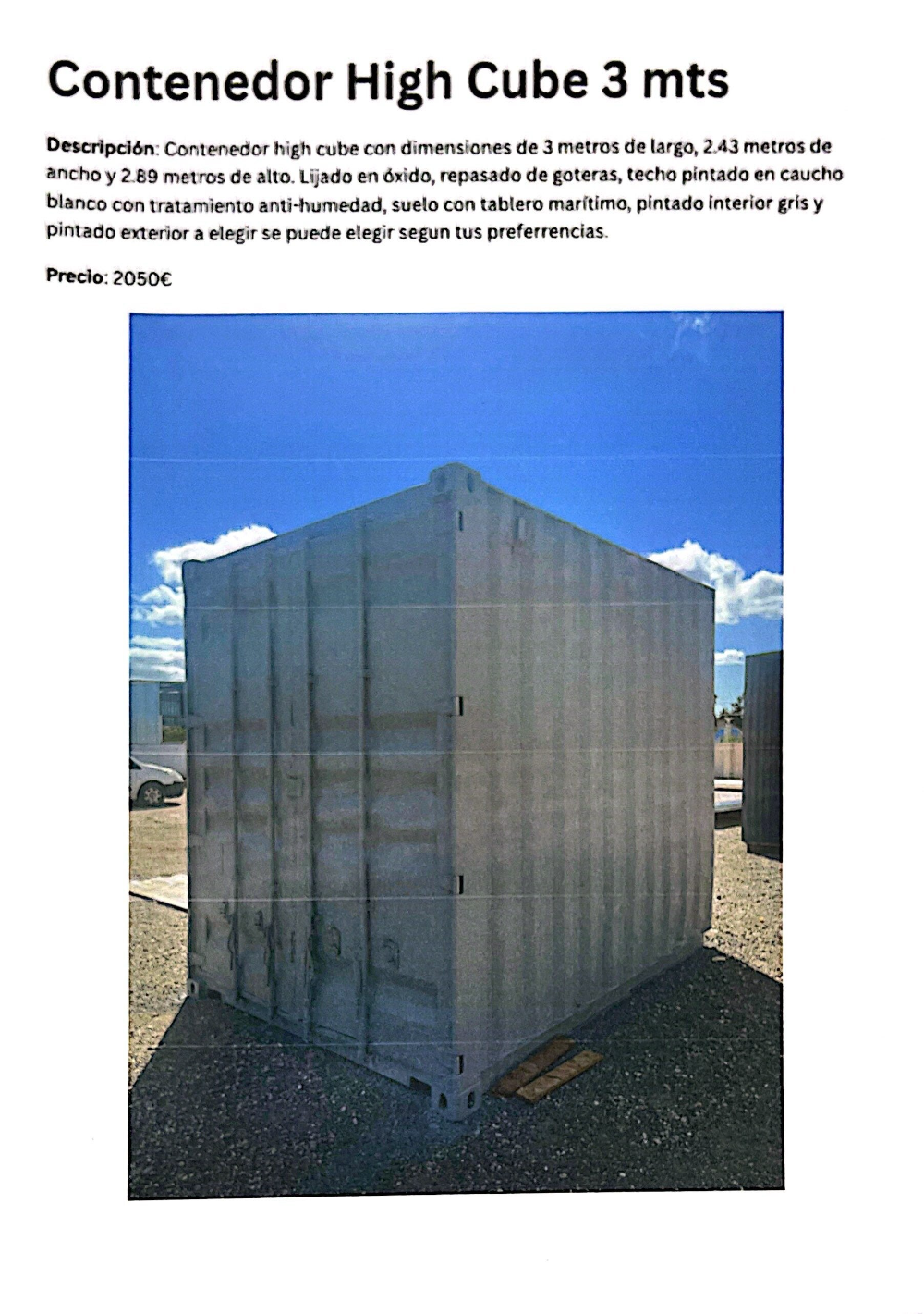 Contenedor high cube de dimensiones de 6 metros de largo, 2.43 de ancho y 2.89 de alto.